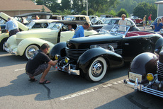 On the other side of the Museum's parking lot you will find a mix of activities; The ACD Club is performing Technical Inspections on members cars, The Ladies are arriving for their noon "Ladies Tea" and "Vintage Treasure Sale", Last Minute Cleaning and Detailing before Saturdays Show that will take place in Eckhart Park and the Cords are getting ready for their caravan trip to Kendallville for the Aviation and Autovation Fair as part of their 75th Anniversary activities. The Cords were escorted by the Indiana State Police driving what else but Cords... "Cop Cords"